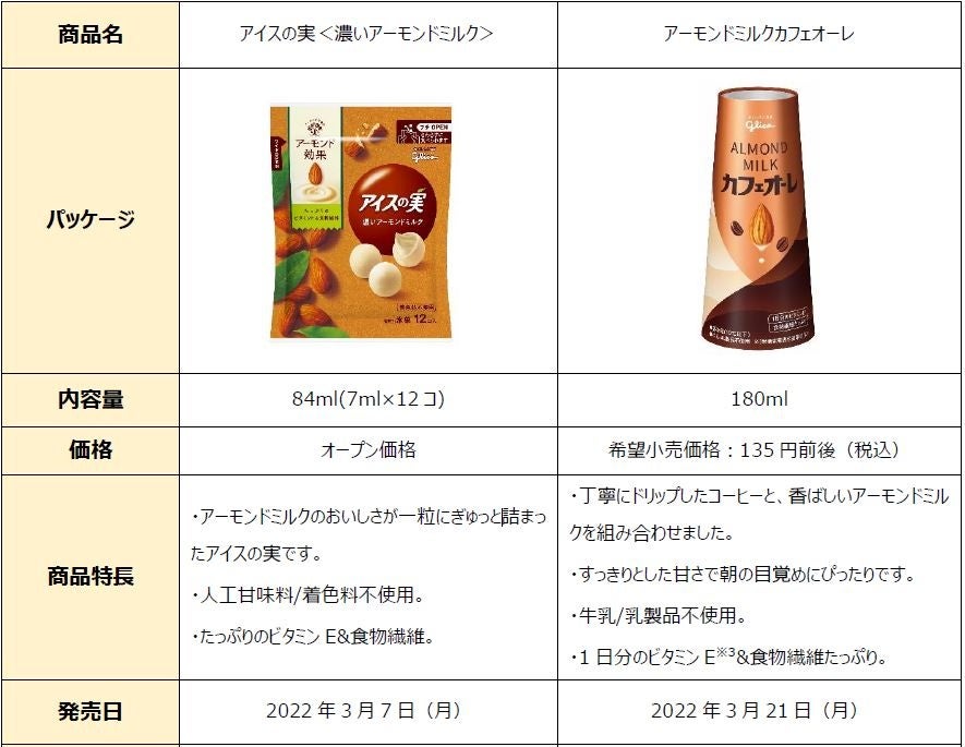 江崎グリコ株式会社は、日本のアーモンドミルク市場シェア No.1*¹の「アーモンド効果」と同原材料を使用した、「アイスの実<濃いアーモンドミルク>」を2022年3月7日(月)に、「アーモンドミルクカフェオーレ」を同年3月21日(月)に全国発売します。