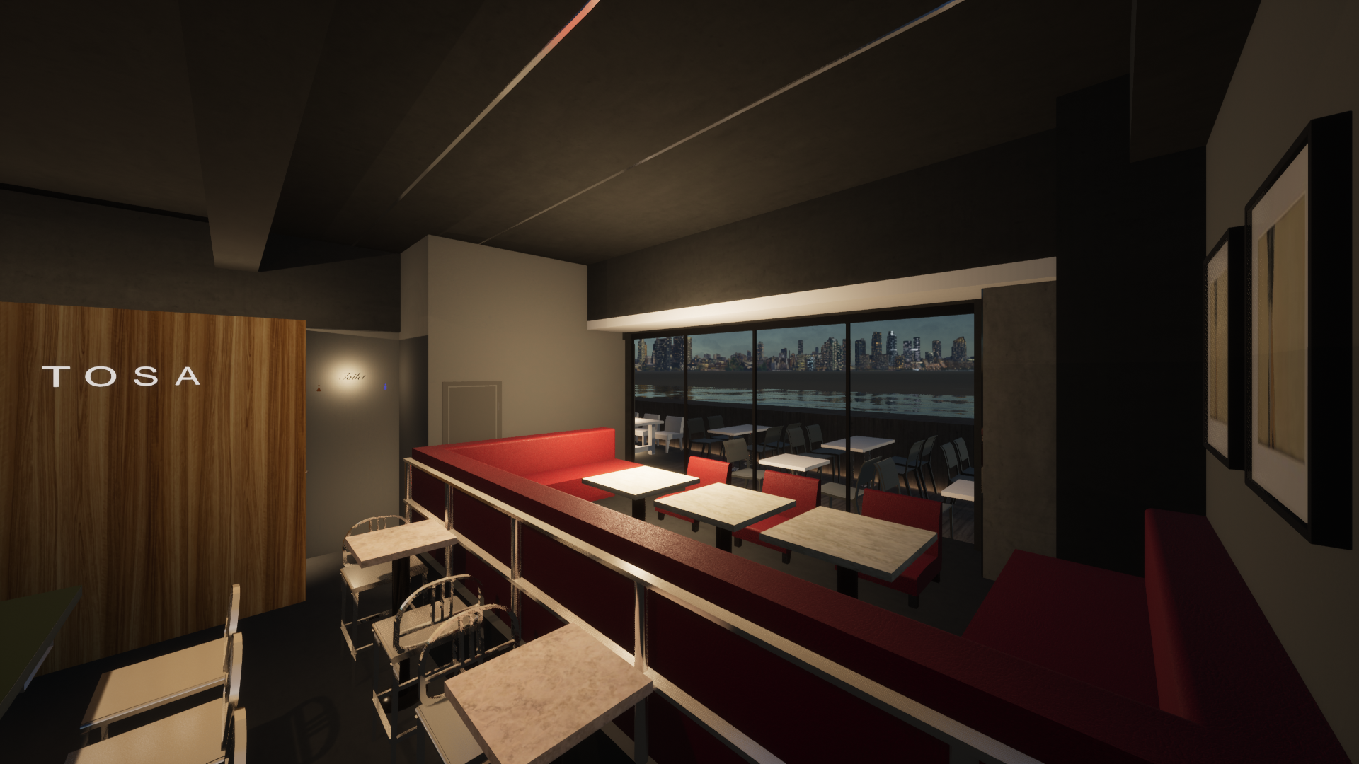TOSAは中央公会堂を一望できる絶好のロケーションに位置し、開放的なリバーサイドテラス、赤いソファがシンボルのラウンジシート、気軽に立ち寄れるカジュアルなスツール席とスタンドスペースを有します。