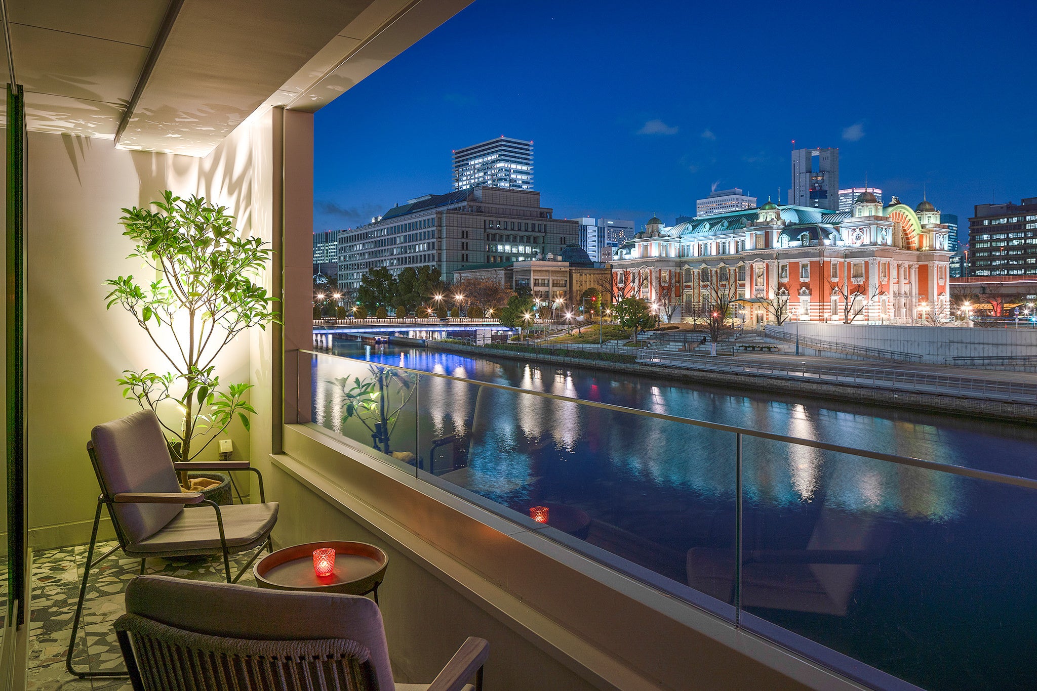 (写真)THE BOLY OSAKAからの眺望。土佐堀川と重要文化財の中央公会堂。