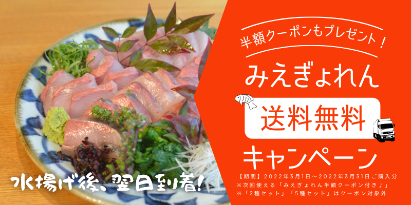 産地直送サイト「エドノイチ」では、鮮度に徹底的にこだわる漁業組合、三重漁連協同組合(以下三重漁連)の商品を期間限定で送料無料にする【みえぎょれん送料無料キャンペーン!】を開催!さらに、キャンペーン対象商品を購入者した方全員に次回使える「三重漁連半額クーポン」もプレゼント!