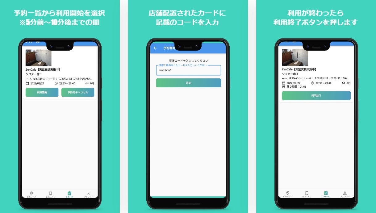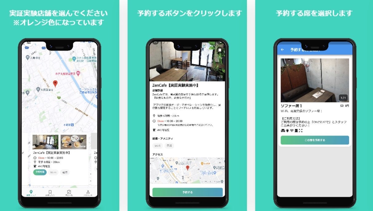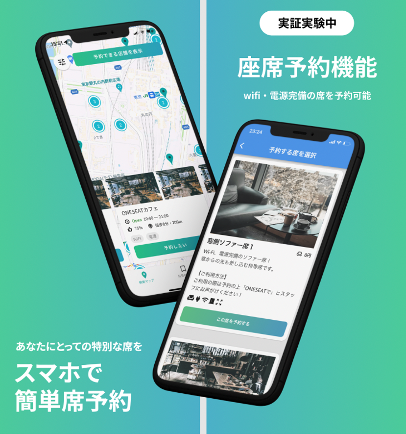 カフェの利用については、食事以外にも「リラックス」「作業」など飲食以外のメインの目的を持っていく方が多い状況です。ONESEATは1席の『空間』の魅力を伝える為、まずは「電源の使える座席」を予約できるサービスを展開致します。現在リリースしている、「Wi-Fi・電源カフェをマップで検索ーONESEATー 」内で座席予約の利用が出来るようにしてまいります。