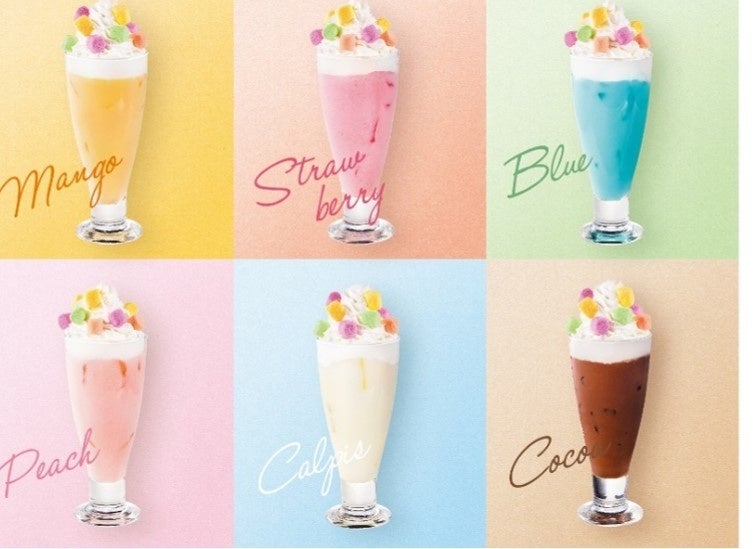 (左上から時計回り:マシュマロマンゴーミルク、マシュマロいちごミルク、マシュマロブルーミルク、マシュマロココア、マシュマロカルピスミルク、マシュマロ白桃ミルク)