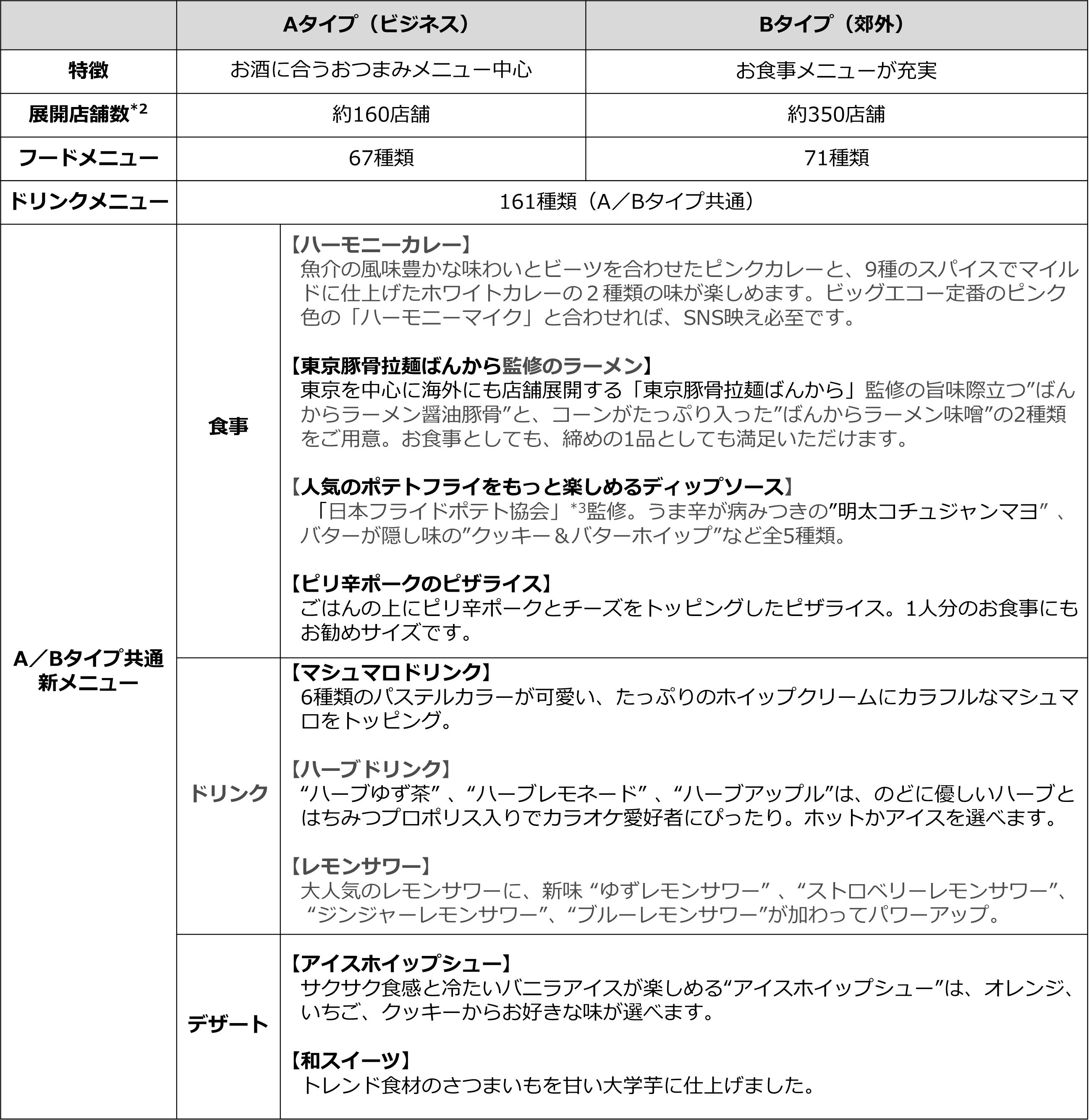 ■ビッグエコーグランドメニュー A/Bタイプ共通新メニュー一例