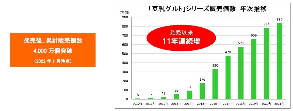 「豆乳グルト」シリーズは、2010年4月の発売から11年連続で伸長しております。