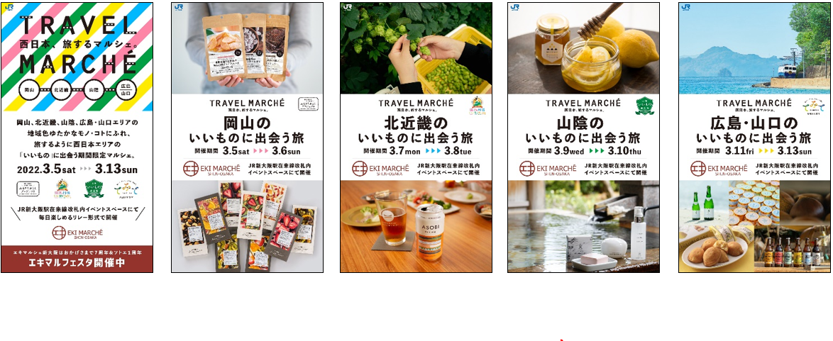 岡山の「ふるさとおこしプロジェクト」、福知山の「北近畿おいしいものマルシェ」、米子の「山陰いいもの探県隊」、広島・山口の「てみてプロジェクト」を通じてうまれた魅力的な商品や事業者さまがリレー形式で登場します。JR西日本エリア自慢の地域の魅力や商品をぜひ、来てみて、見てみて、味わってみて!