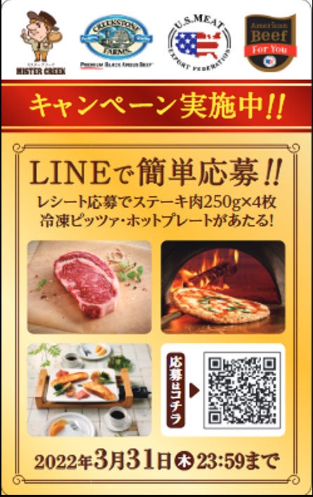 アメリカで最も人気が高いブラックアンガスビーフの専門ブランドであるクリークストーン。ブラックアンガス牛の、ほど良いサシが入った柔らかい肉質と、旨味が続く上質な味わいが楽しめるブランドビーフです。丸紅ミートセレクションでは、2022年3月1日から31日までにかけて、以下のキャンペーンラベルが貼られたクリークストーン・ブラックアンガス・ビーフを流通店舗でお買い上げいただき、所定の条件を満たしてご応募頂いた方を対象にキャンペーンを実施します。詳しくは以下の「キャンペーン概要」をご確認ください。