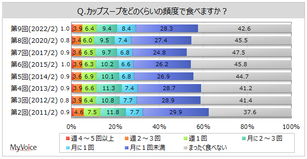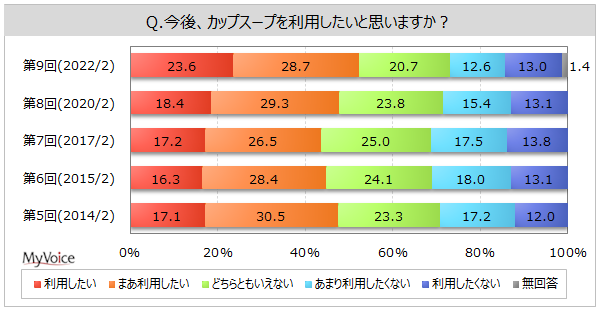マイボイスコム株式会社(東京都千代田区、代表取締役社長:高井和久)は、インターネット調査を中心に提供している伊藤忠グループのリサーチ会社です。この度、9回目となる『カップスープの利用』に関するインターネット調査を2022年2月1日~5日に実施し、10,229件の回答を集めました。本調査のカップスープは、使い捨てカップ入りでお湯を注ぐタイプを対象としています。春雨スープやワンタンは含みますが、味噌汁やお吸い物は含みません。調査結果をお知らせします。