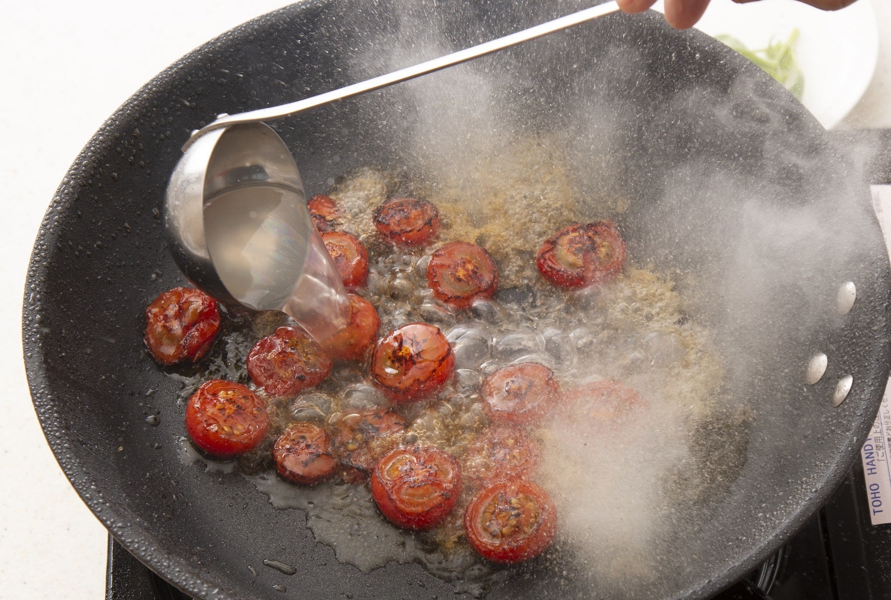 フレッシュトマトのソースは水っぽくなりがち。ミニトマトを使い、よく焼いて余分な水分を飛ばし、うまみを凝縮させる。焦げは「うまみ」になり、湯を注げば「だし」になる。恐れず焦がそう。