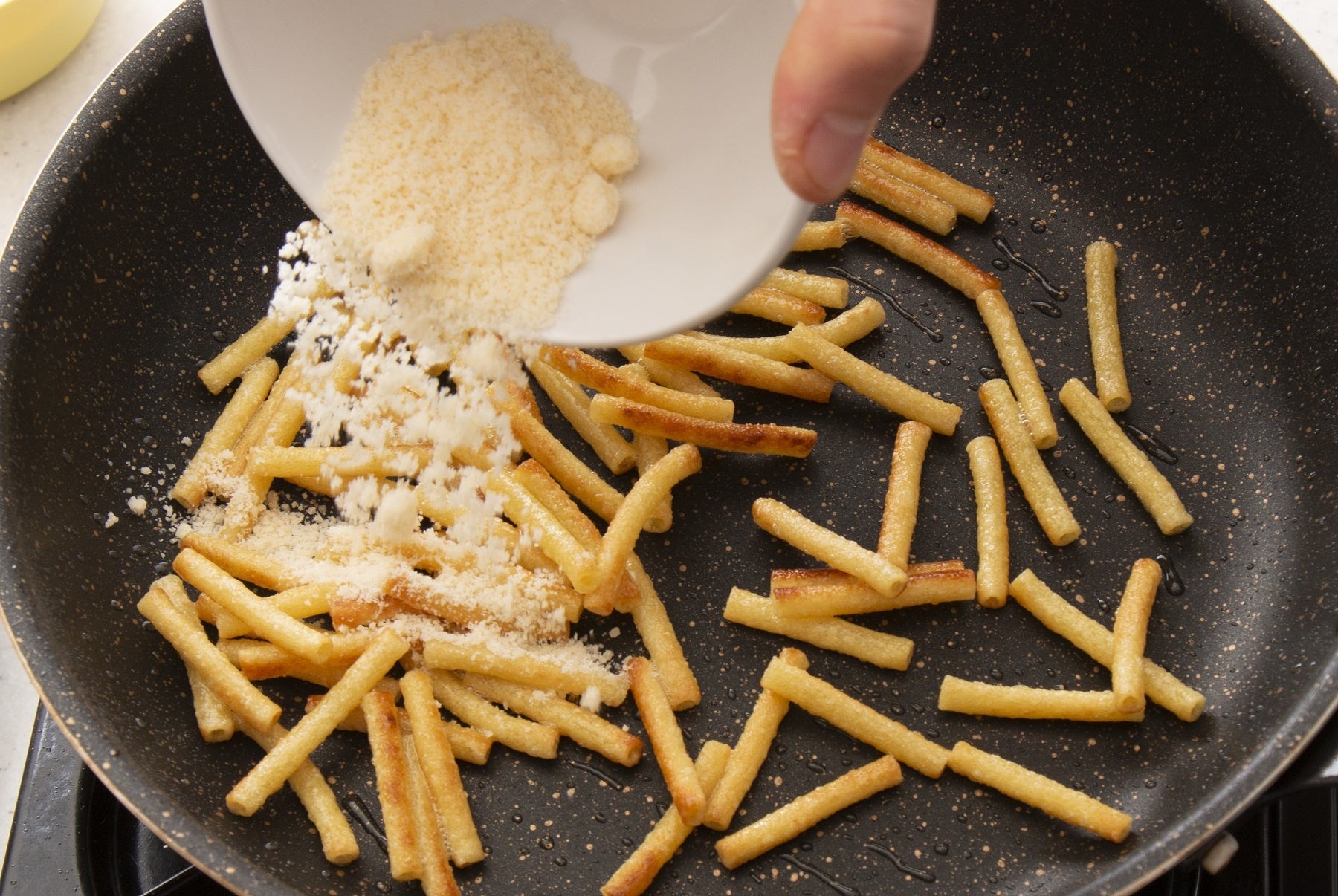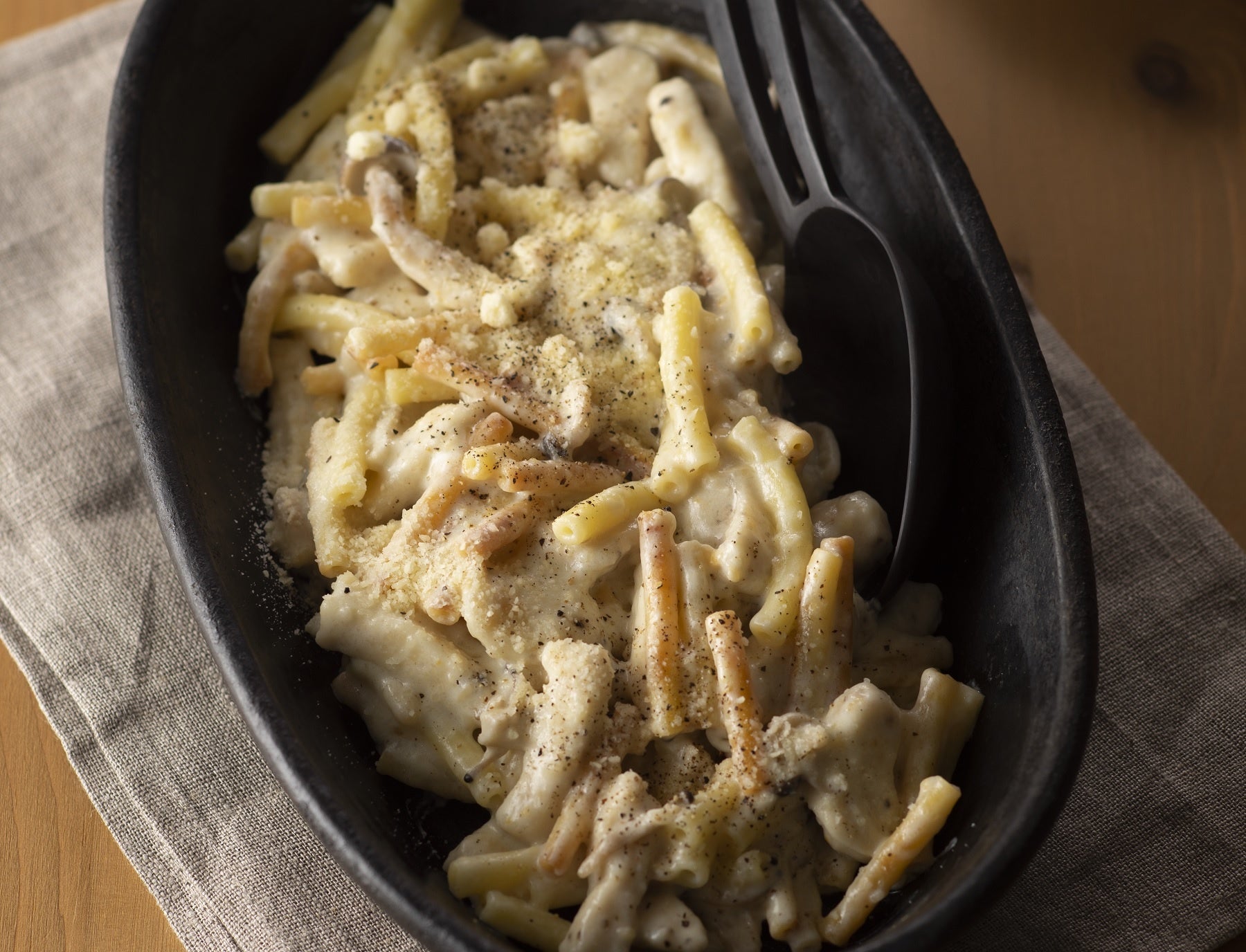 マカロニの半量をフライパンで焼き、カリカリにして粉チーズをかけるワザで、こんがり焼けたマカロニのような食感を実現。