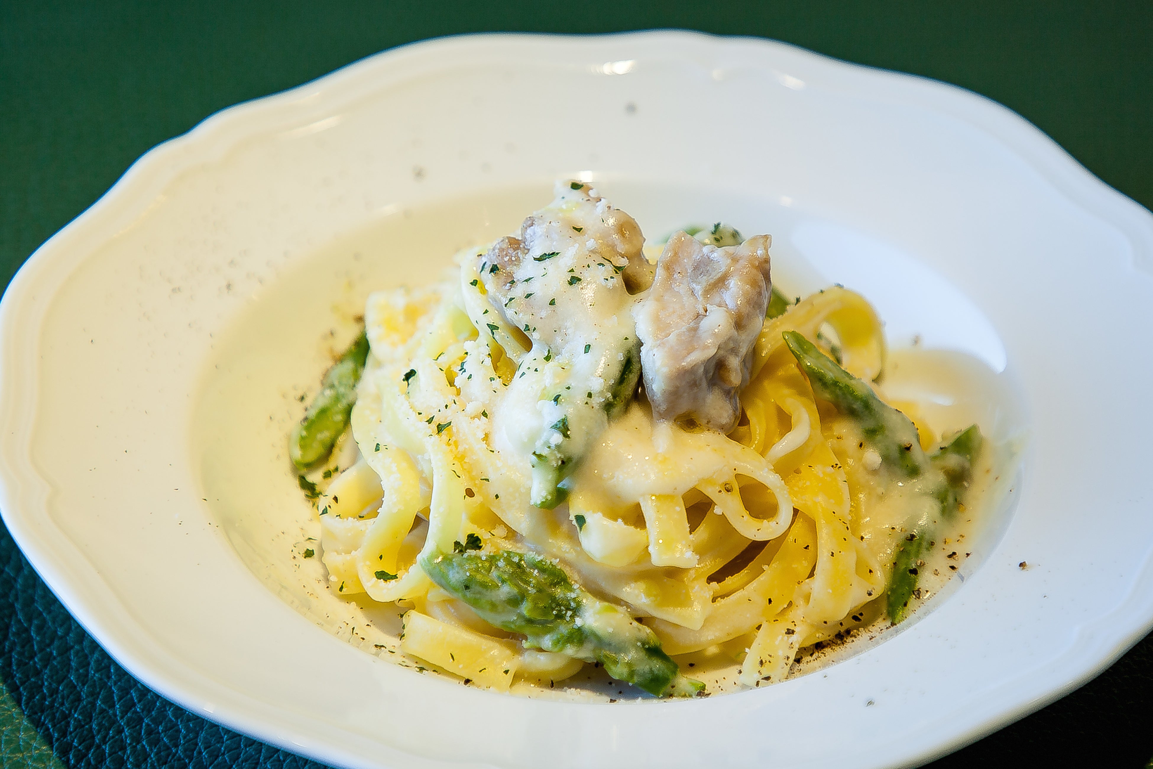 ふっくら柔らかい若鶏のうま味とアスパラガスの野菜の甘みを生かした濃厚なクリームソースがタリアテッレと絡む相性の良い一品です。