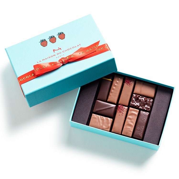 イチゴ風味のダークガナッシュの限定レシピと、定番で人気のガナッシュとプラリネを詰合せ。