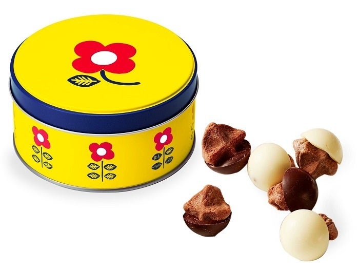 サクサク食感が人気の「コロコロワッフル」とチョコがひとつに。黄色・紺・赤の北欧テイストの缶がキュート。