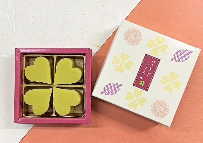 ハート型の「芋ようかん」を4つ並べて四つ葉のクローバーに。箱を開けるとたちまち笑顔に。