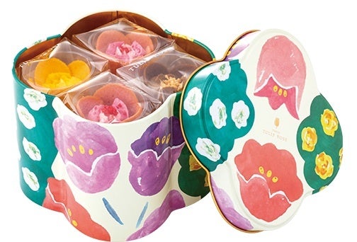 チューリップのラングドシャの中にとろけるショコラのローズ入り。一面の花園のようなデザイン缶に詰合せ。