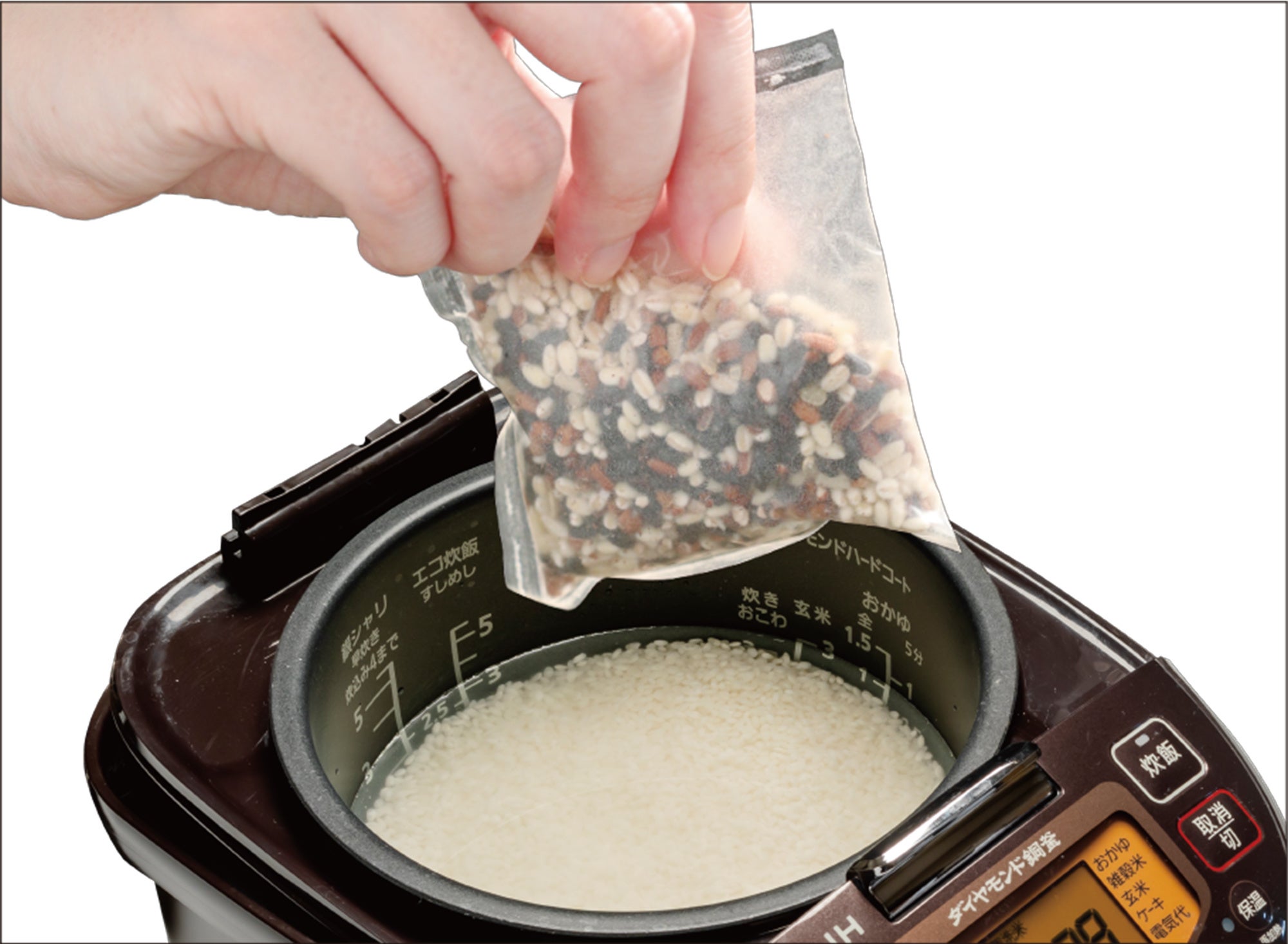 プラスチック製品の代わりとして使える、熱で溶けてゴミが出ない、環境にやさしいフィルムを内装に採用し、雑穀米を包装しています。炊飯器に入れて炊くと、フィルムは溶けてなくなります。