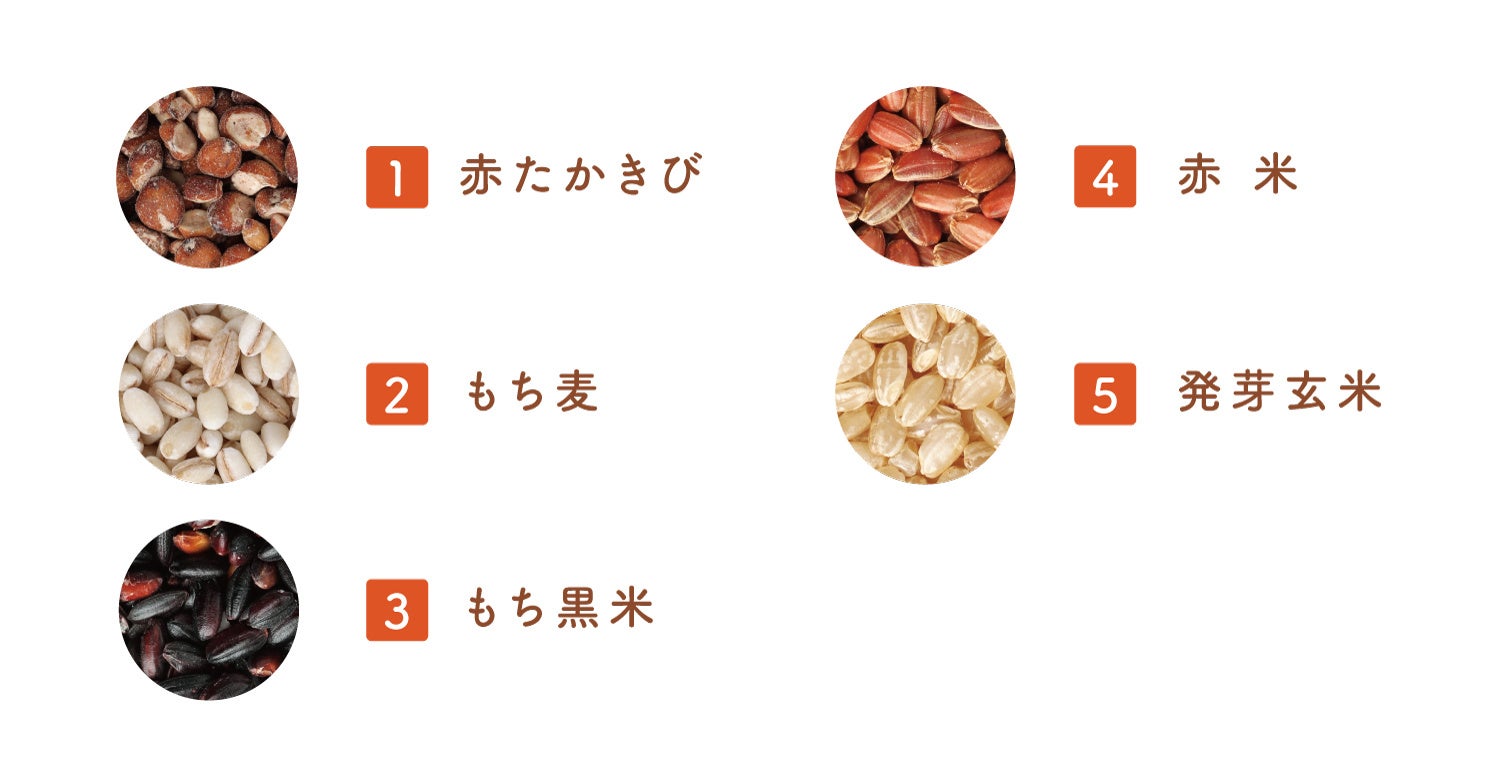 ⑤ 発芽玄米:玄米をわずかに発芽させたもの。弾力とボリューム感があり、噛むほどに味わいが増えます。
