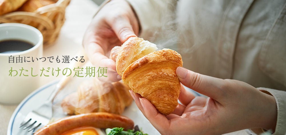 パンドの「選べる定期便」は、初回からも、次回からもお届け商品を自分好みに変更できる、自由で新しい焼きたてパンのサブスク(定期購入)サービスです。毎月同じものが届く一般的な定期便とは違い、毎回届くものを自由にカスタマイズできることで、「次はどのパン食べよう?」と選ぶところからお楽しみいただけます。