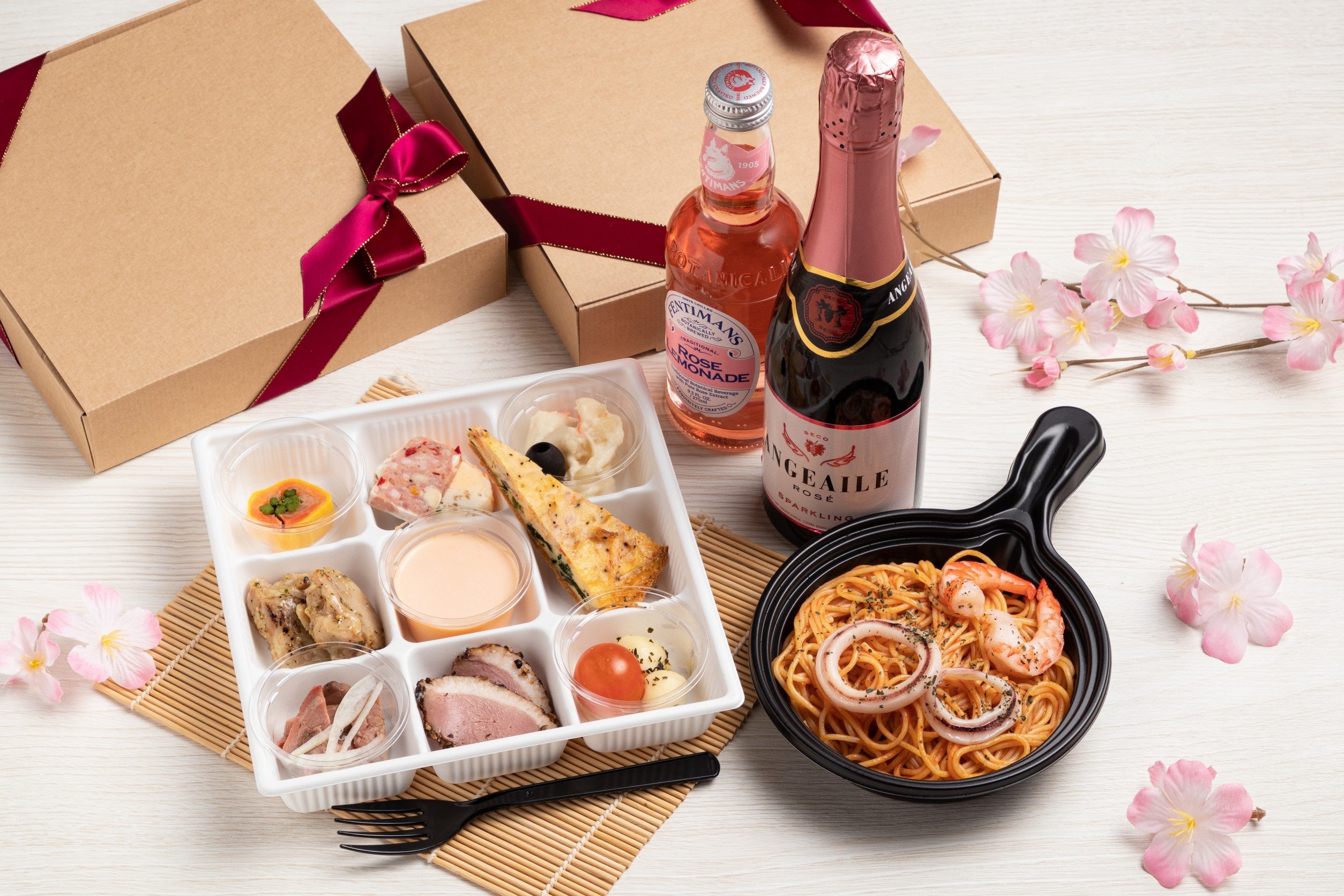 春の食材を使った多彩な料理に、〆には海鮮トマトパスタを召し上がれ。料理は可愛らしいギフトボックス包装でお届け。春のオンライン懇親会にぴったりなプランです。