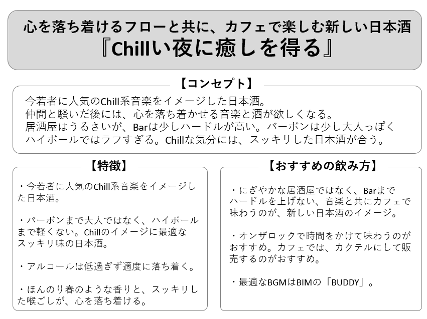 学生が企画した日本酒のコンセプトは、今若者が感じる「Chill」を表現した日本酒。