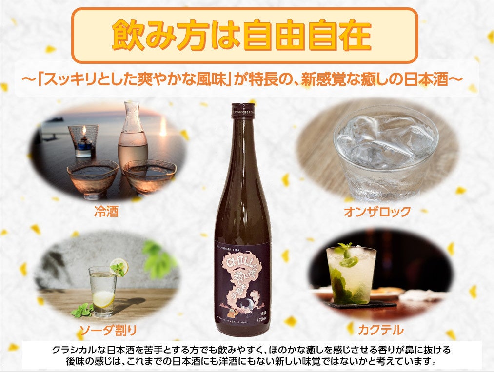新商品「CHILLな夜に癒しを得る」は、「チルい」気分つまり「リラックスして気分がよい」時にマッチした日本酒です。