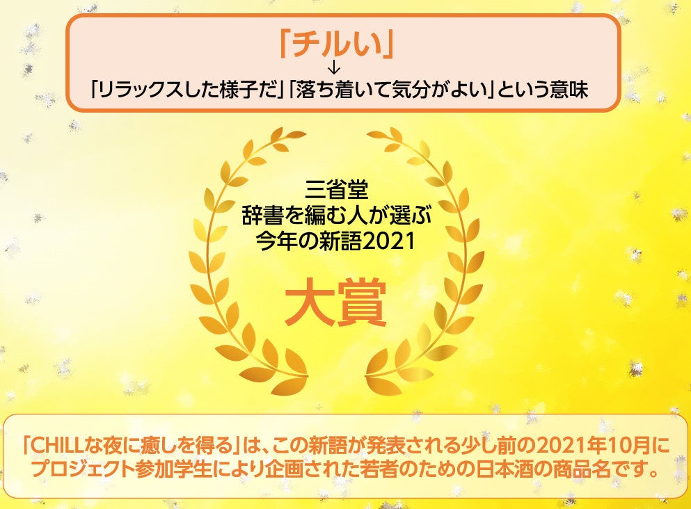 この日本酒のコンセプトが決まった2021年10月から少し経った12月1日、音楽から派生した「チルい」という言葉は、三省堂が発表した「三省堂辞書を編む人が選ぶ今年の新語2021」で大賞を受賞するほどに、注目される言葉となっていました。同新語大賞では「リラックスした様子だ」「落ち着いて気分がよい」という意味で紹介されています。