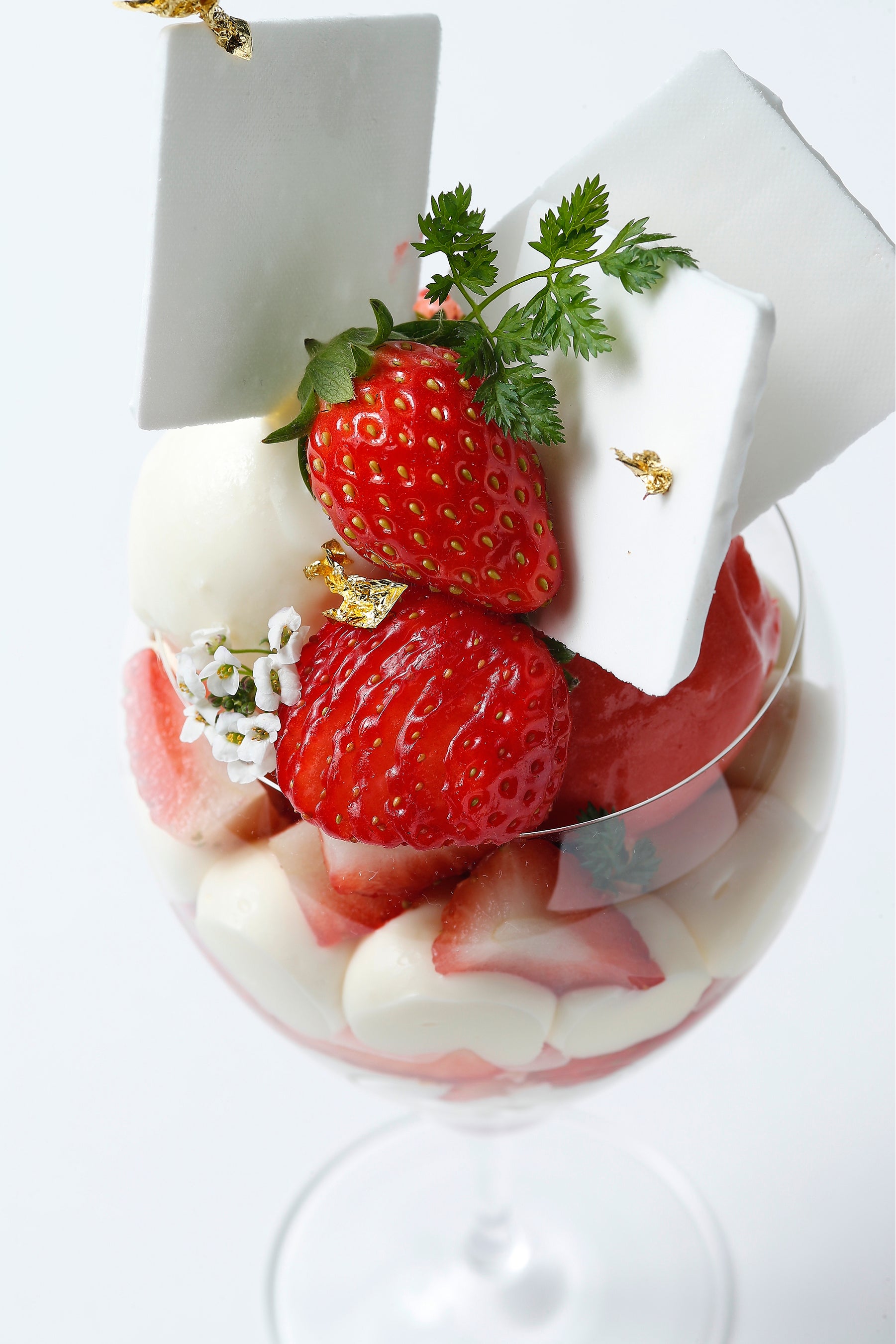 トップ部分は、フレッシュないばらキッスとレンゲが飾り付けられ、赤白緑のイタリアンカラーを生み出しています。いばらキッスのしっかりとした甘みとバランスのよい酸味、豊かな果実味をお楽しみいただいた後は、酒粕の芳醇な香りがぎゅっと詰まった酒粕のジェラートと、いばらキッスの豊かな風味をそのまま活かした苺のジェラートが登場。その後は、柚子酒でマリネしたいばらキッス、柚子の風味をプラスした滑らかでくちどけの良いクリームへと続きます。柚子といばらキッスのさわやかな風味とクリームの甘みが合わさり、絶妙なコンビネーションを生み出しています。クリームの下からは、ほんのり塩気を効かせたライスクリスピーとクランブルが登場し、食感に変化をもたらします。