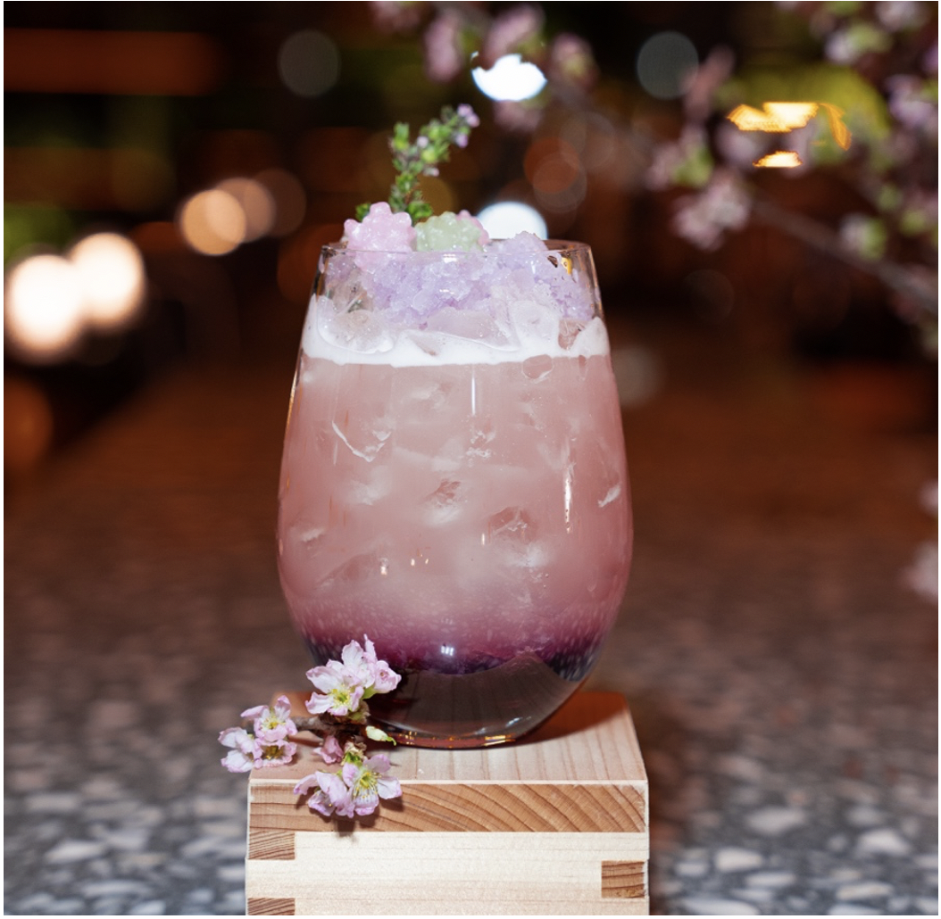 グラデーションピンクの色合いで夜桜を表現した日本酒カクテル。雪解けをイメージした桜色のシャーベットは移りゆく四季の流れを、シャーベットの上にあしらった金平糖で夜の星空を表現しました。大人が楽しむ“夜桜”をお楽しみくださ い。