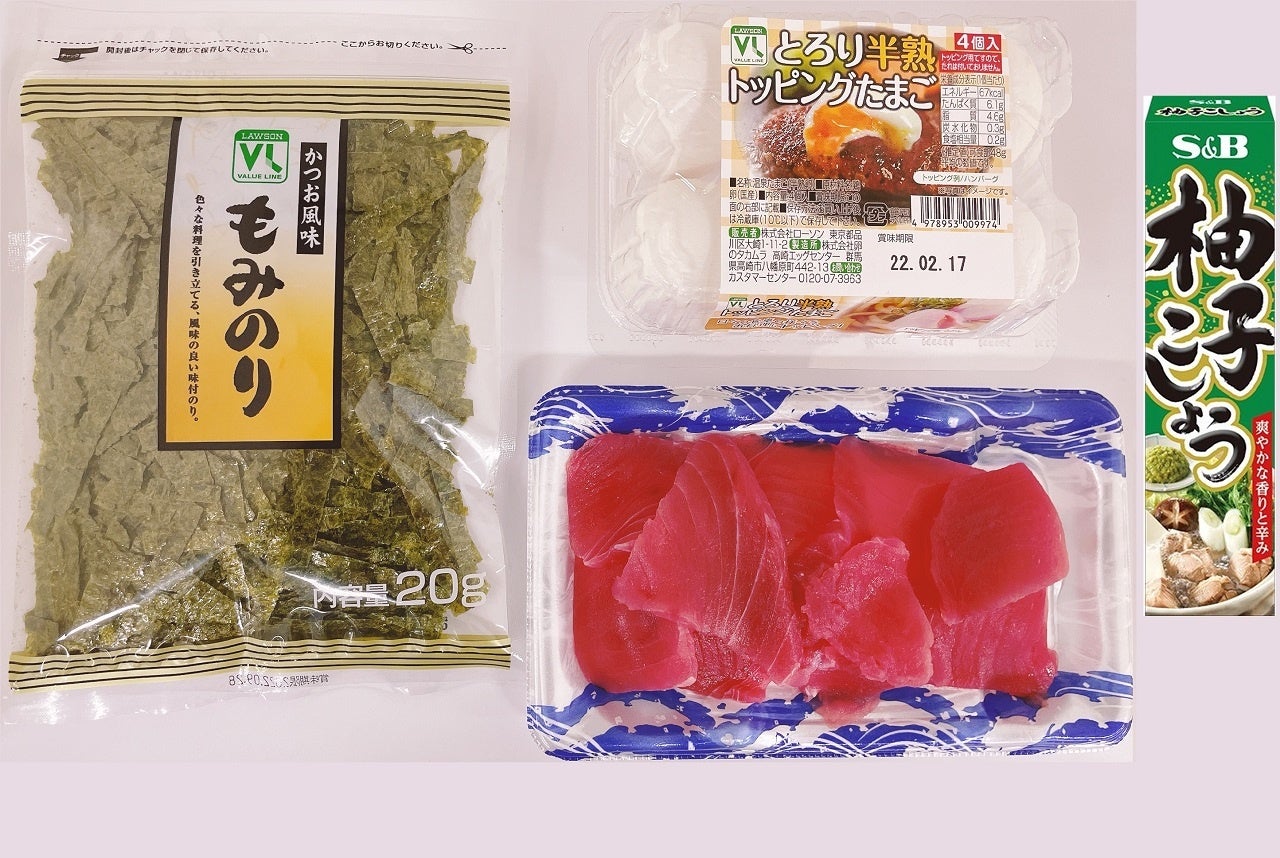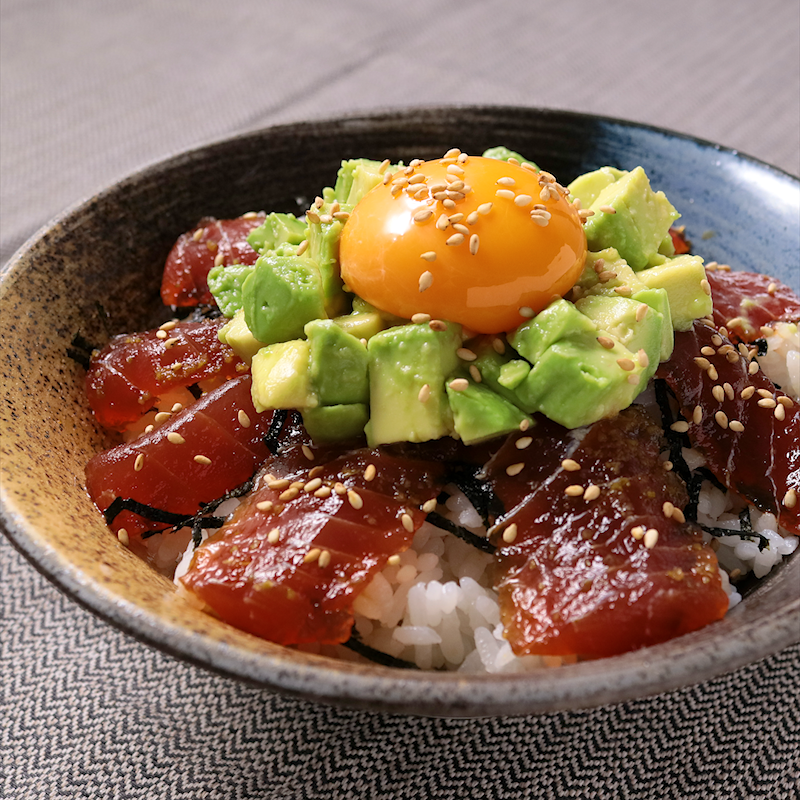 アボカドとベストマッチな食材として外せないのは「マグロ」ですね。醤油・みりんなどに漬けたマグロをアボカドと一緒にご飯にのせ、のりや卵⻩をトッピングすれば、ボリューム満点の丼ぶりになります。わさびも良いですが、ゆず胡椒がとても良く合いますのでオススメです。ローソンストア100 ですべての食材が揃います。