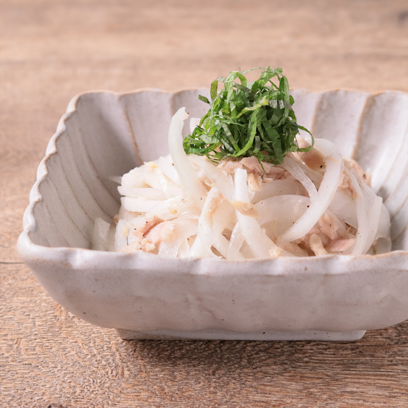薄切りにした新⽟ねぎは5 分ほど水にさらします。後はツナと和えて塩コショウで味を整えるだけです。新⽟ねぎの味わいをシンプルに楽しめます。
