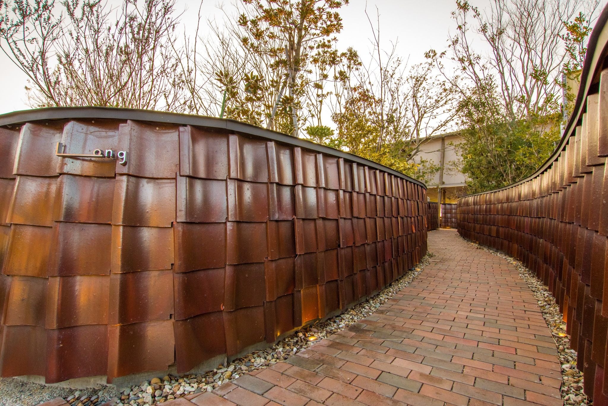 客席に着くまでのエントランスには、自然素材の安らぎと洗練を兼ね備えた淡路瓦を壁面に使い20mの瓦ロードを演出しました。この土地で歴史を紡いできた古民家の瓦を使うことにより、受け継がれてきた自然や人への想いを未来へつなげるアプローチをイメージしています。全長36mもの長さのある建築は温かみを感じる杉の木と間伐材を使用し、高床式住居のスタイルにより強い日射と激しい降雨を避け、通風性に優れた建物となっています。
