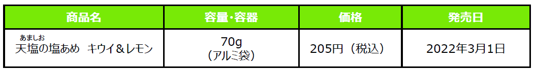 株式会社天塩(本社:東京都新宿区、代表取締役社長:鈴木 恵)は、2022年3月1日(火)より、 「天塩の塩あめ キウイ&レモン」を発売します。本商品は、“塩屋が作った塩あめ”の原点に戻り、大粒の天日塩を飴の中に粒感を残したまま入れることで、塩を強調した飴に仕上げました。また、塩粒で甘さが引き立つキウイ味が新フレーバーとして初登場。塩味と酸味のバランスが良いレモン味と合わせて、夏にぴったりな飽きのこない爽やかな味わいです。