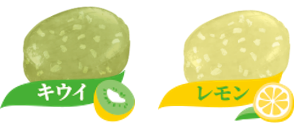 塩粒で甘さが引き立つキウイ味。酸味と塩味のバランスが良いレモン味。