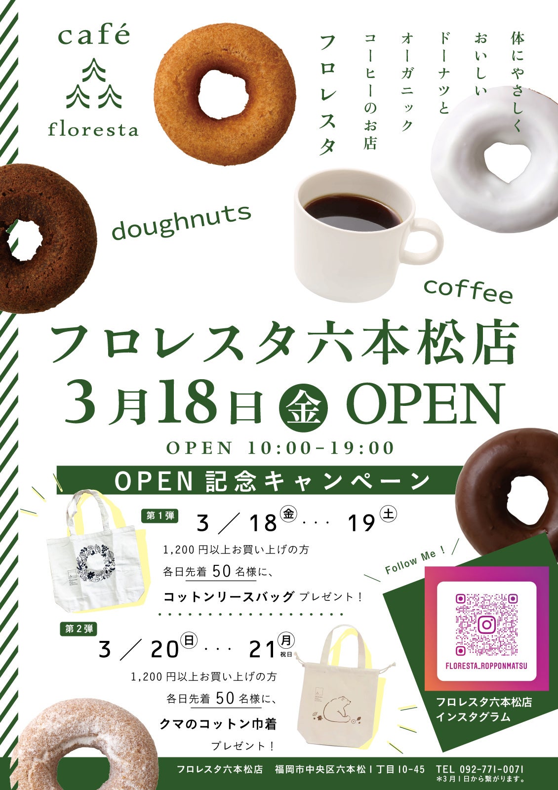 株式会社フロレスタ(本社:大阪市浪速区/代表取締役社長:辻尾吉厚)は、手作りドーナツ専門店「フロレスタ六本松店」を3月18日(金)福岡県福岡市にグランドオープンいたします。