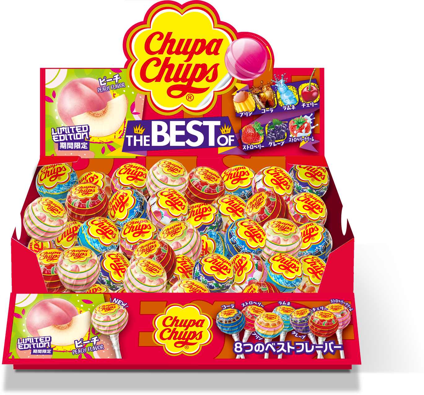 発売以来、世界中で愛されるロリポップキャンディ「チュッパチャプス」の人気 フレーバー7種類に、期間限定フレーバー『ピーチ』が追加され、その時の気分に合わせて、好きな味のキャンディを選び、その味を楽しむことができる商品となっています。