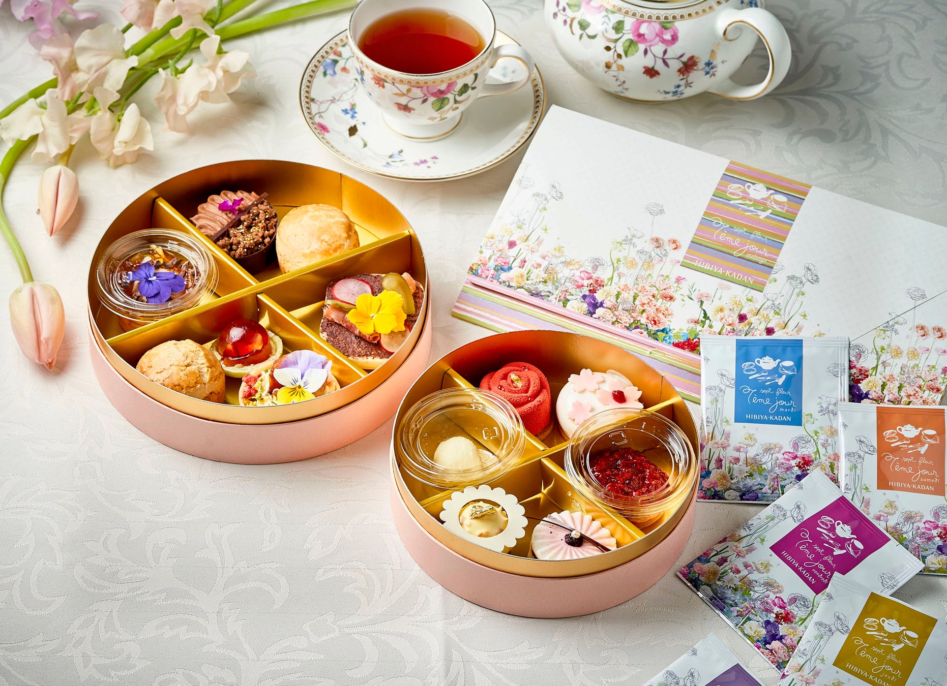 『フラワーアフタヌーンティーby日比谷花壇』はテイクアウトでもご利用可能です。スイーツとセイヴォリーの他、日比谷花壇が提供する 7 種類のフローラルハーブを配合したブレンドハーブティ「7éme jour セッチエム ジュール」もお付けいたします。ご自宅でも花の香りや見た目、味を存分にお楽しみください。