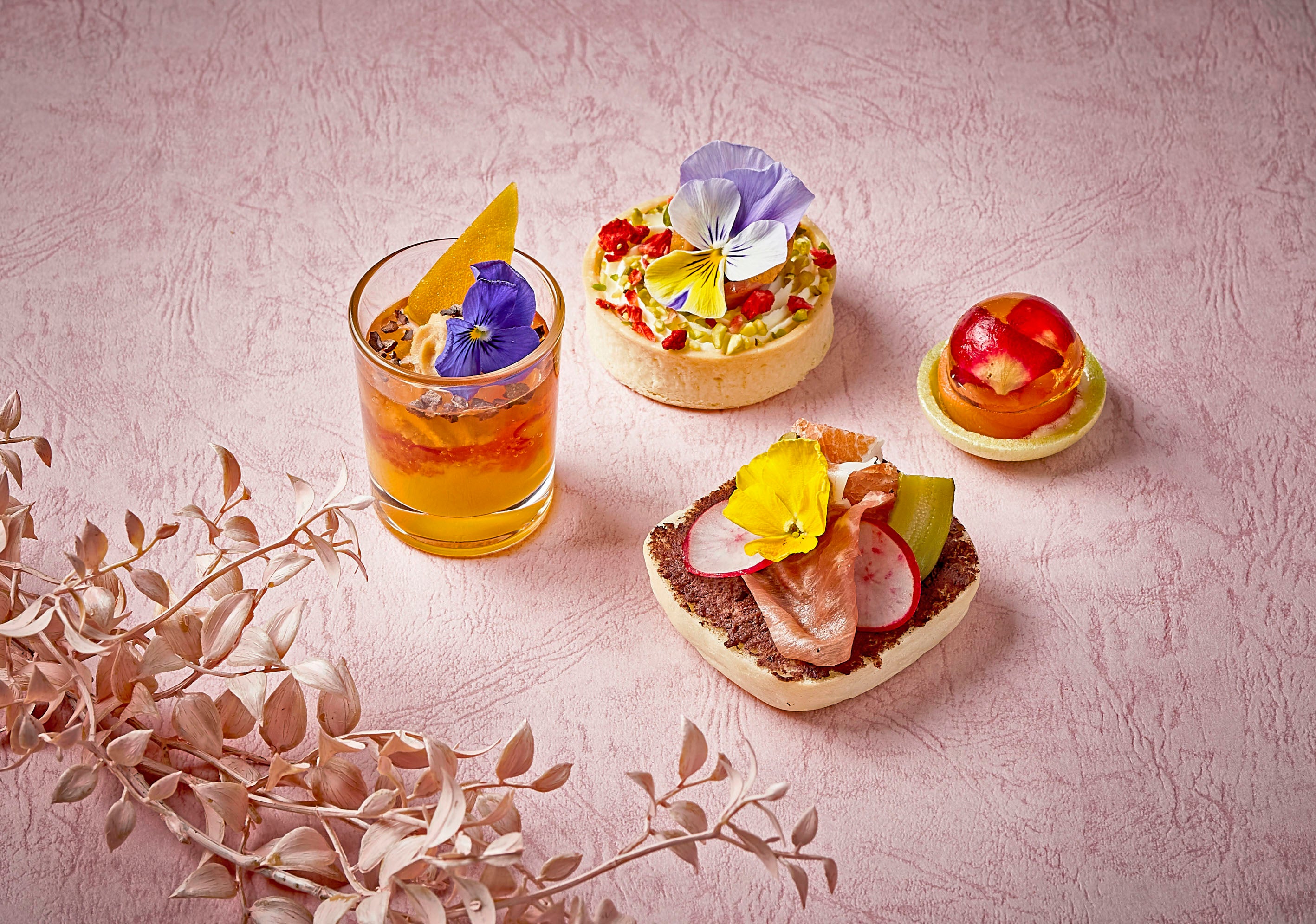 そのフラワーボックスにのせてお届けするのは、ザ・リッツ・カールトン大阪のエグゼクティブペストリーシェフ ファビアン・マルタンが「花」をテーマに創作したスイーツ5品とセイヴォリー4品です。スイーツはそれぞれ桜・スミレ・ポピー・薔薇・ラベンダーをイメージした見た目と味に仕上げています。またセイヴォリーにもエディブルフラワーをふんだんに使い、春の訪れを祝うのにふさわしい華やかなアフタヌーンティーとなりました。