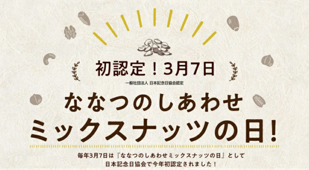 またこの度、毎年3月7日は『ななつのしあわせミックスナッツの日』として一般社団法人日本記念日協会の認定を受け、制定しました。新発売と記念日制定を記念して割引キャンペーンを開催します。