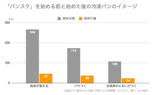 「パンスク」利用の前後で”冷凍パン”に関するネガティブなイメージが変わったかどうか質問したところ、「風味が落ちる」「パサつく」「冷凍庫のにおいがつく」3つの回答ともに約5分の1にまでネガティブなイメージを持っている人が減少したことが判りました。