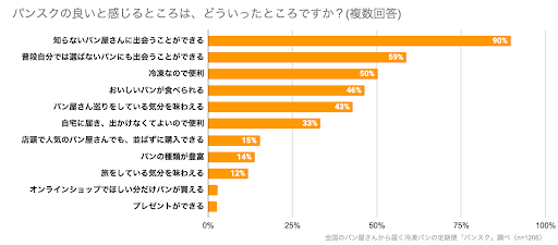 パンスクの良いと感じるところについて質問したところ、1位「知らないパン屋さんに出会うことができる」、2位「普段自分で選ばないパンにも出会うことができる」、3位「冷凍なので便利」という結果になりました。パンスクの特長でもある「知らないパン屋さんに出会うことができる」は、9割の人が挙げるほど高く評価されていることが判りました。