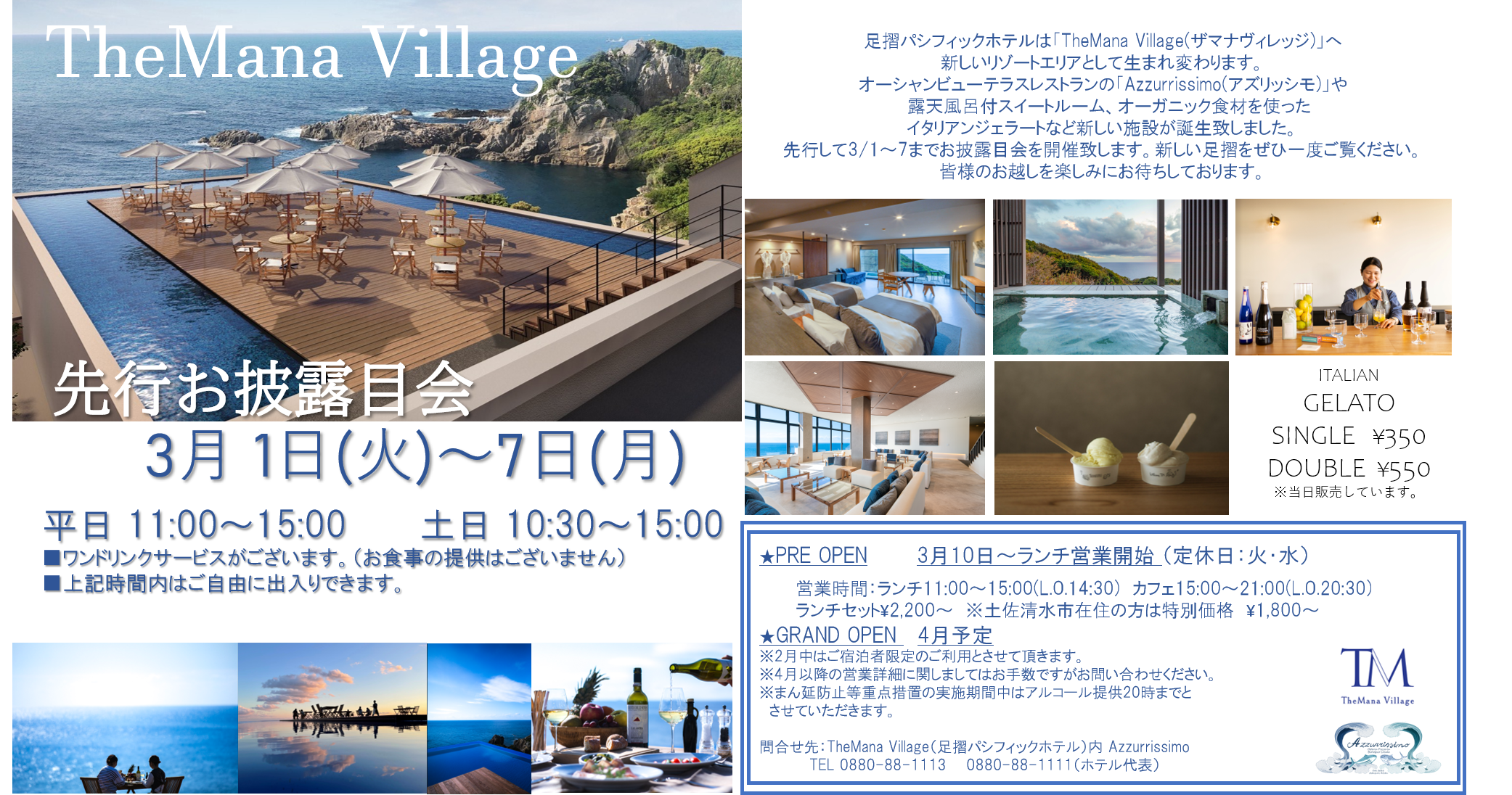 株式会社Catalystは、2019年に地元企業より承継した高知県の老舗旅館を、アジア屈指のリゾート施設「TheMana Village(ザマナビレッジ)」として再生。2月10日から宿泊者様限定でプレーオープンしておりました太平洋を一望できる”海に浮かぶレストラン”Azzurrissimoが、3月10日から宿泊外のお客様もご利用可能に。地産地消にこだわったイタリアンを提供し、地域に人流を創出いたします。