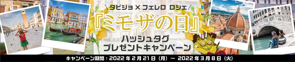 多くの人が現地イタリアのミモザ文化に触れるきっかけになるように、HISが展開する女子旅コミュニティ「タビジョ」とコラボ。 2月21日(月)〜 3月8日(火)の期間中「タビジョ」の公式インスタグラムで「#フェレロロシェミモザ」と「#タビジョプレゼントキャンペーン」のハッシュタグをつけてイタリア旅行の写真を投稿した方の中から抽選で10名様に、「フェレロ ロシェミモザミニフラワーボックスキット」と「フェレロ ロシェ 3粒入り」をプレゼント!