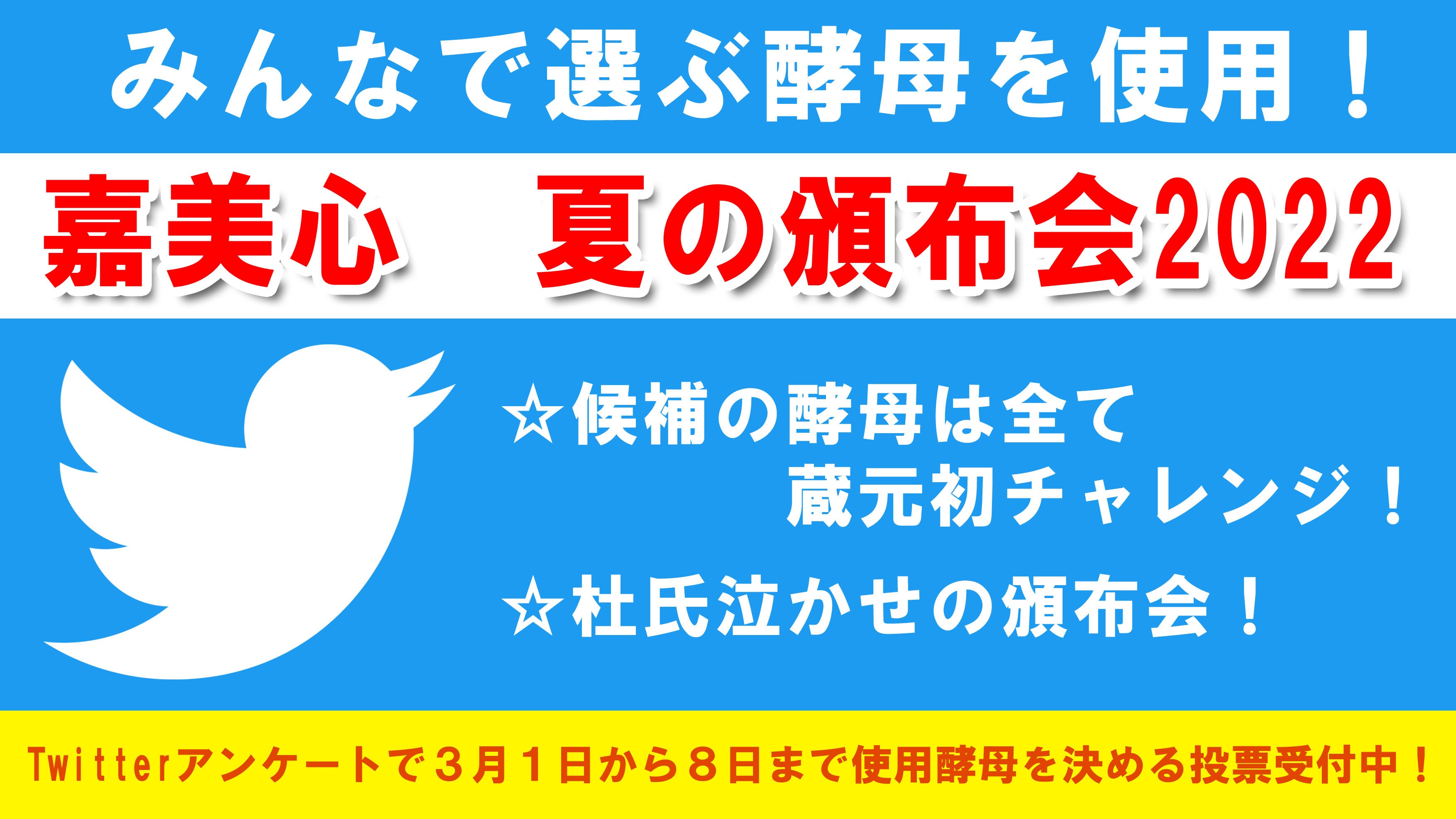 嘉美心酒造株式会社では、twitterのアンケート機能を使用し、一番得票数の多かった酵母で醸す『嘉美心 夏の頒布会2022 チャレンジシリーズ ~Episode①~』を受注中