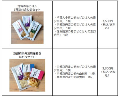 京都府京丹波や千葉県大多喜などの名産地をはじめとし、4地域の筍を使用した「筍まぜごはんの素」、京都府京丹波の筍をぜいたくに使った「京都京丹波の筍の山椒煮」、「京都京丹波の筍の煮物」や、「春の味覚筍ご堪能セット」や、筍まぜごはんの素専用のブレンド米などを新セット商品に加えて、多彩なラインアップでお届けします。2022年4月20日(水)※2より期間・数量限定で発売いたします。