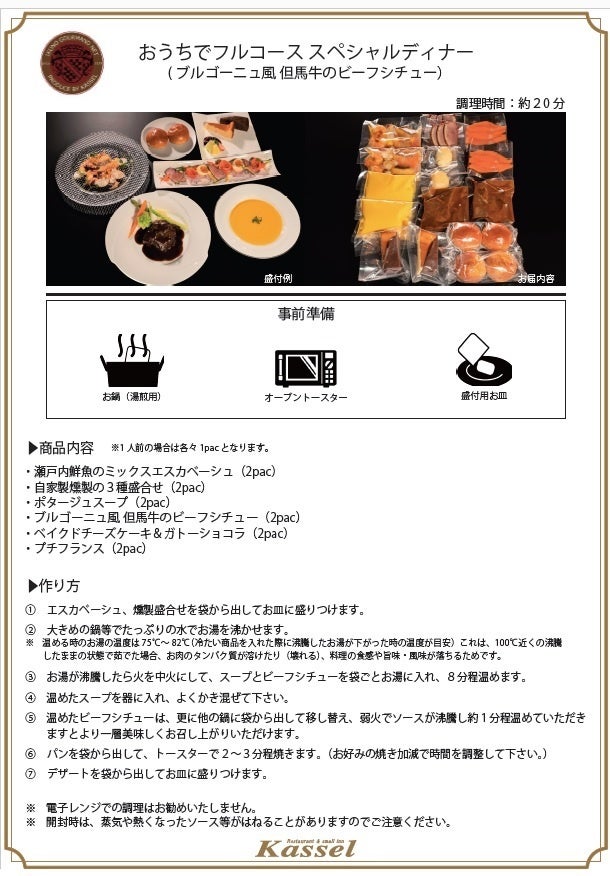 お鍋とオーブントースターがあれば、いつでもどこでも本格フルコースがいただけるよう、経験豊かなカッセルのグランシェフがご自宅でも再現しやすいよう考案いたしました。約20分で、どなたでも本格レストランの「おうちディナー」が完成できます。