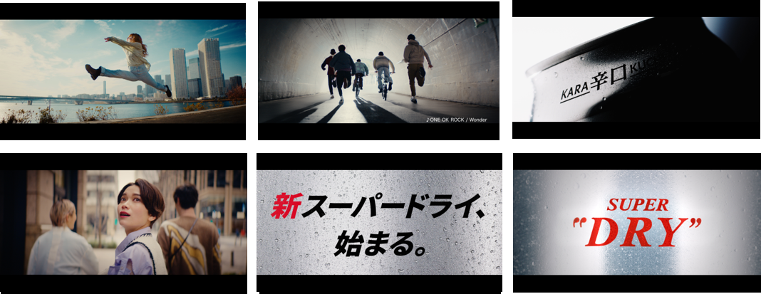 今回のTVCMは“世界は変わった。”“スーパードライも変われ。”というコピーから始まり、新しくなった「スーパードライ」の缶体が徐々にあらわになっていく様子を描くことで「スーパードライ」が36年目にして初めてフルリニューアルすることを訴求します。“新スーパードライ”の登場に、街行く人々の心が浮き立つ様子と“発売36年目、新スーパードライはじまる。”というメッセージを通じてフルリニューアルする「スーパードライ」への期待感を醸成します。TVCMの楽曲には「ONE OK ROCK」の高揚感溢れる楽曲「Wonder」を使用し「スーパードライ」が持つ躍動感のあるブランドイメージを表現しています。