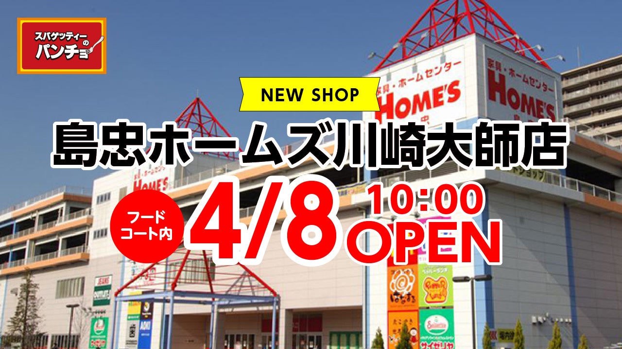 株式会社ファイブグループ(東京都武蔵野市:代表取締役社長 坂本憲史)の関連会社である株式会社B級グルメ研究所(東京都武蔵野市:代表取締役社長 坂本憲史)が運営する飲食店『スパゲッティーのパンチョ』は、「スパゲッティーのパンチョ 島忠ホームズ川崎大師店」を2022年4月8日(金)にオープンいたします。これまでフードコート内の『キッチンパンチョ』モザイクモール港北店、イオンモール甲府昭和店を出店してまいりましたが、今回の『スパゲッティーのパンチョ 島忠ホームズ川崎大師店』はフードコート内へ初めての『スパゲッティーのパンチョ』業態の出店となります。「ナポリスト」との親和性の高さが見込まれる地、川崎大師で、これまで以上に多くの方に「改めてナポリタンはうまい」と感じていただける機会を提供してまいります。