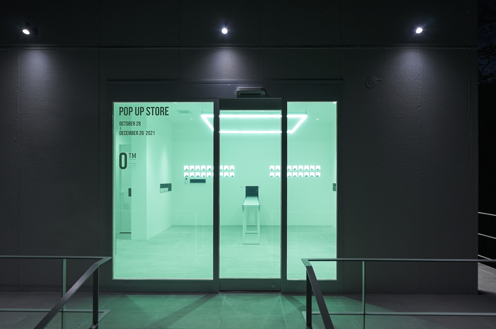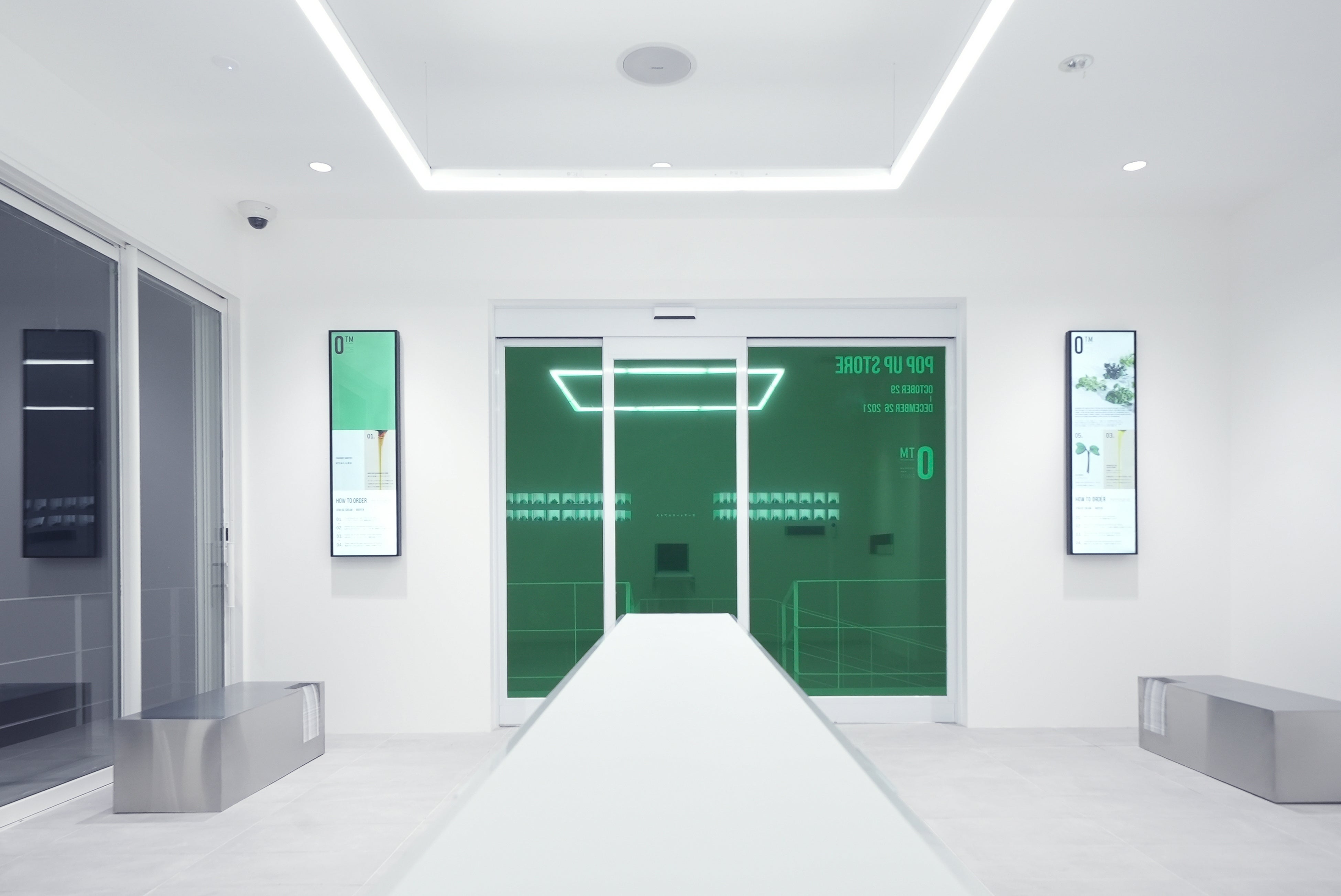 「OTM ICECREAM」は真っ白な空間に直線が映えるラボをイメージしたような内装。エントランス部分のグリーンのガラス戸がプロダクトのマイクログリーンとリンクするPOPな一面もありつつ、提供方法に独特なオートマチックさを出すことで、入口から商品を手にするまで、まるでアトラクションを楽しむようなワクワク感を体験することができます。