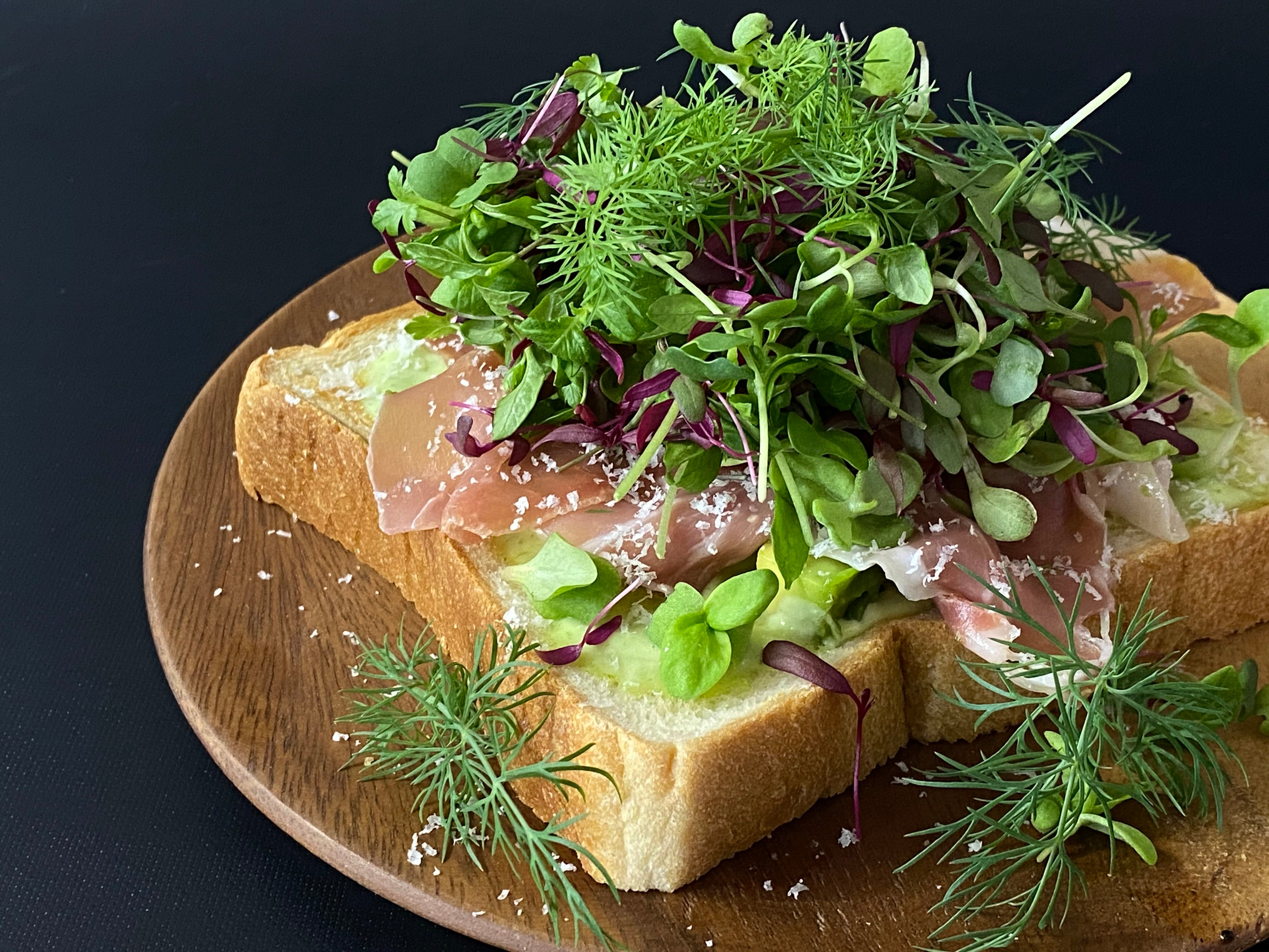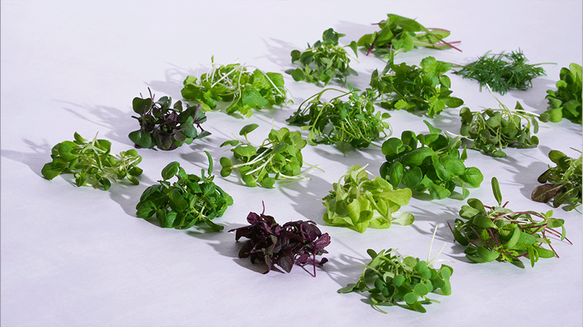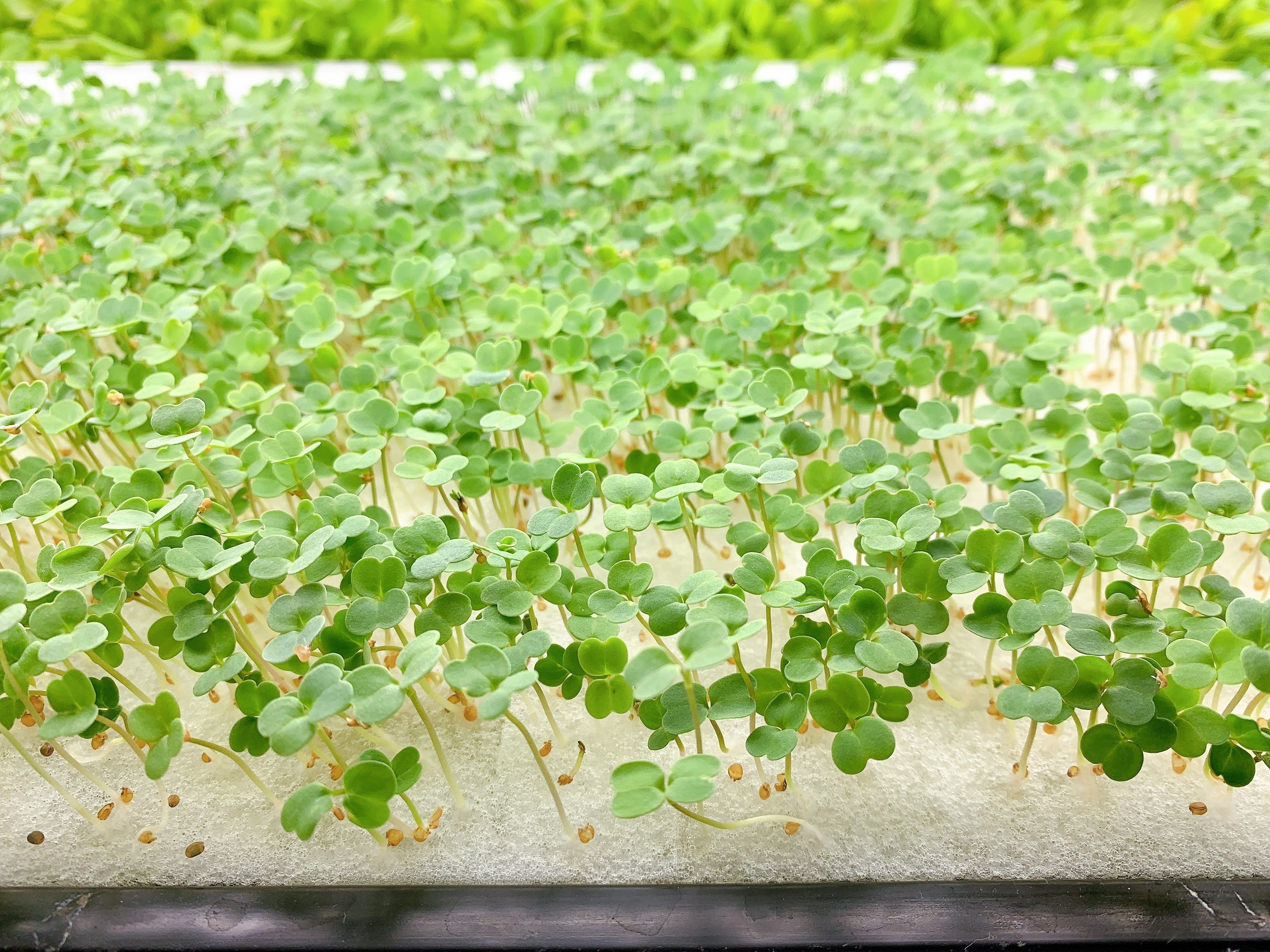 マイクログリーンとは、発芽して1〜3 週間くらいの若芽野菜を指します。5cmにも満たない⼩ぶりの野菜で、ビタミンC、ビタミンK、ビタミンE、ルテイン、カロテノイドなどの栄養素が、成熟野菜の5倍あると言われています。また、カルシウムや亜鉛、マグネシウムなどのミネラルも⾮常に豊富で、美容やダイエット効果も期待されています。通常の野菜と⽐べても緑の⾊味が⾮常に濃く、⾒た⽬も鮮やかなため、⾼級レストランでも使⽤されています。我々は、屋内の農場で空調管理まで行っているので、気候の影響を全く受けず、水耕栽培で農薬を使わずに丁寧に作った清潔な野菜を、安定供給しています。