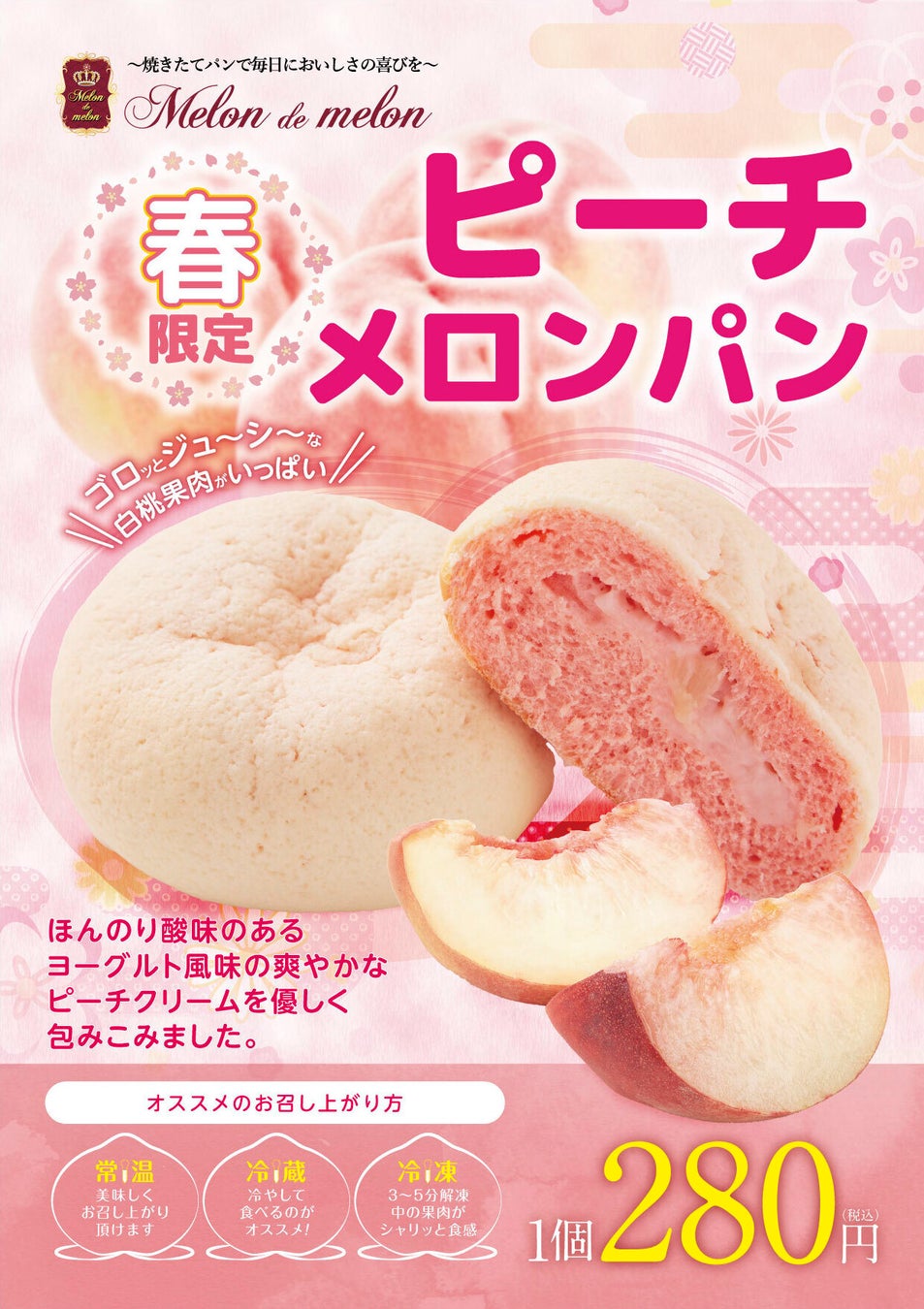 ◎ゴロッとジューシーな果肉入りピーチクリームがたまらない!春の訪れを告げる季節限定メロンパン!