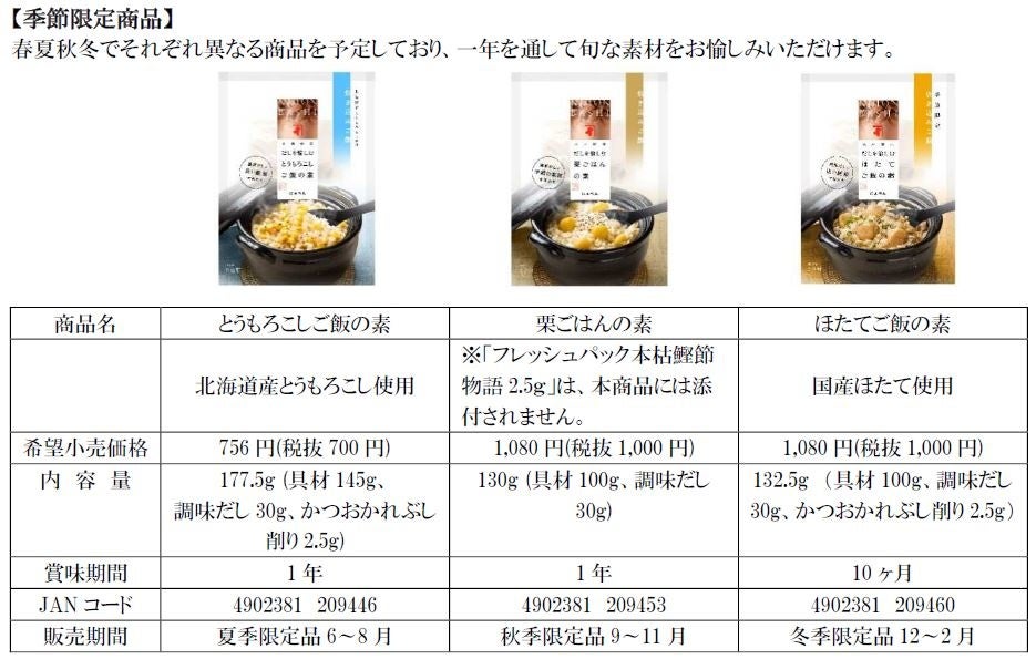 「だしを愉しむ 炊き込みご飯の素」シリーズの季節限定商品は、にんべん商品の中でも、人気のある商品の一つです。ぜひご賞味ください。